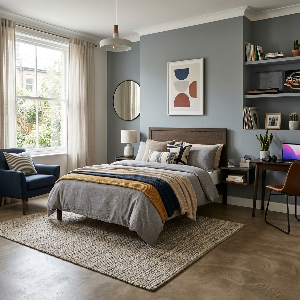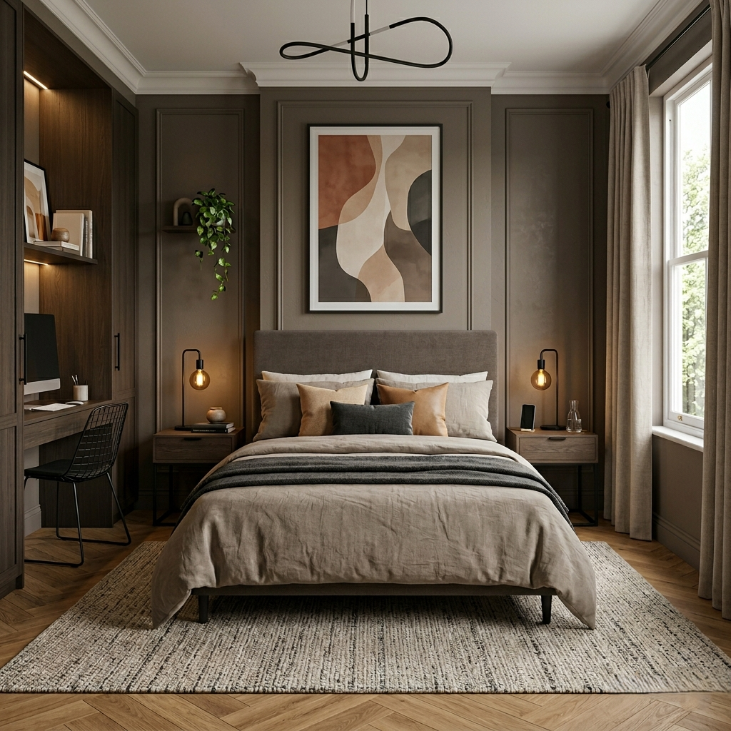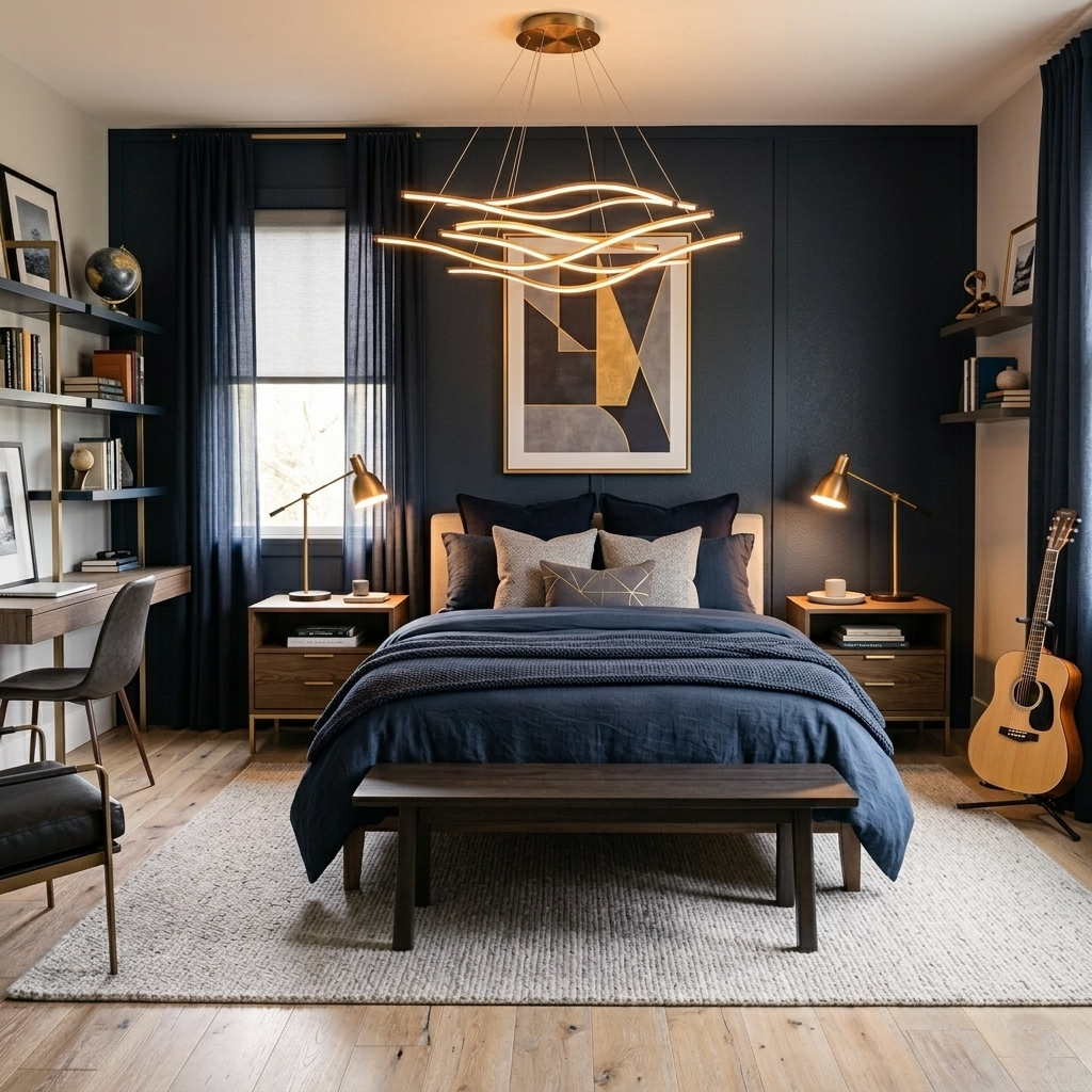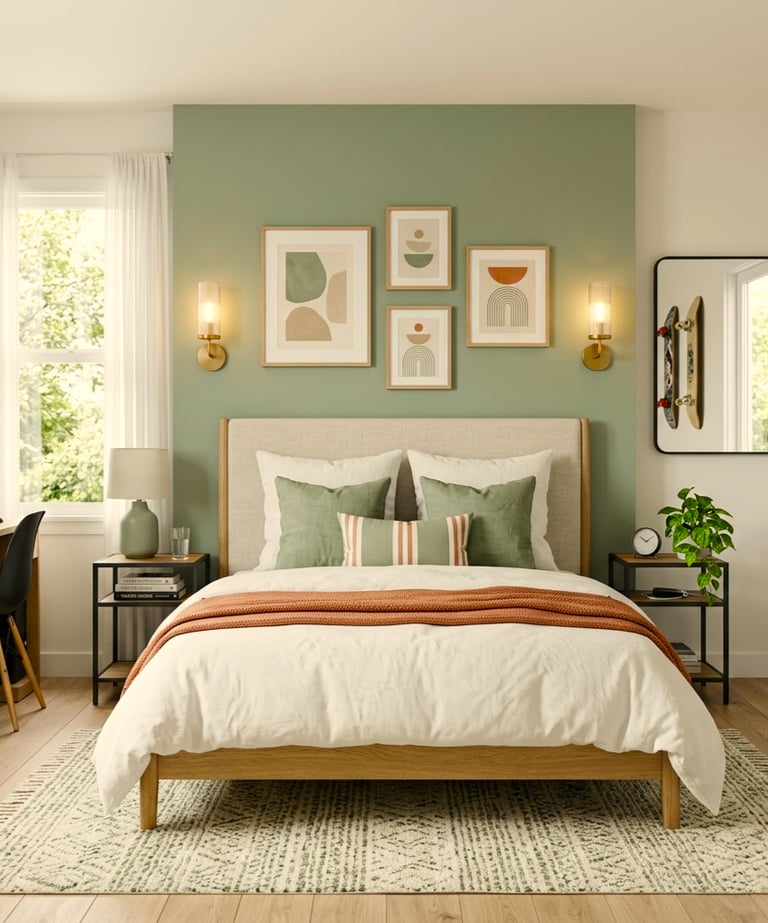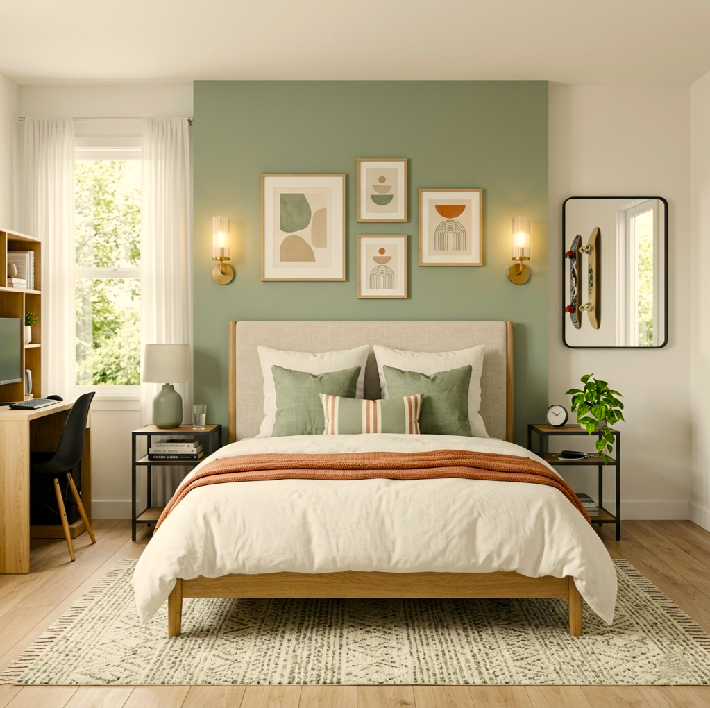 Point focal identifié et mis en valeur (mur décoré, tête de lit, étagère, zone bureau)