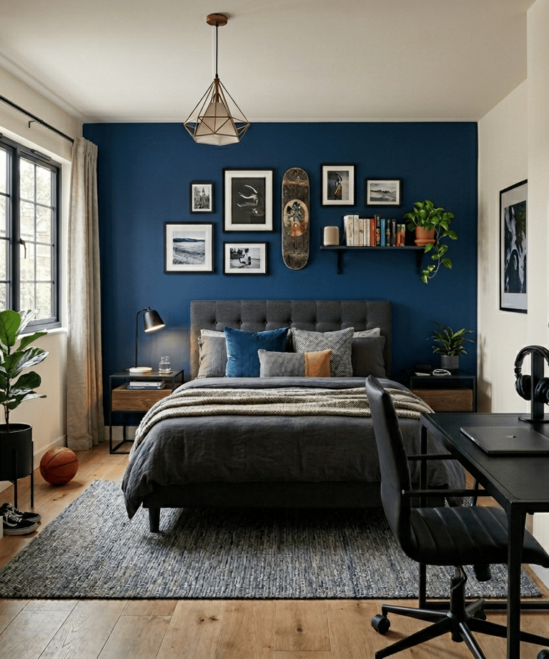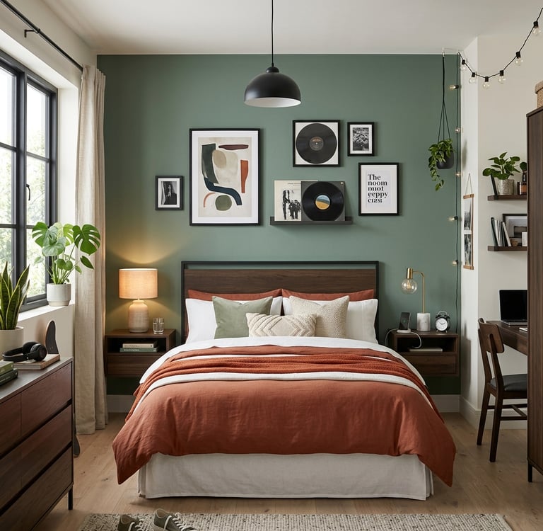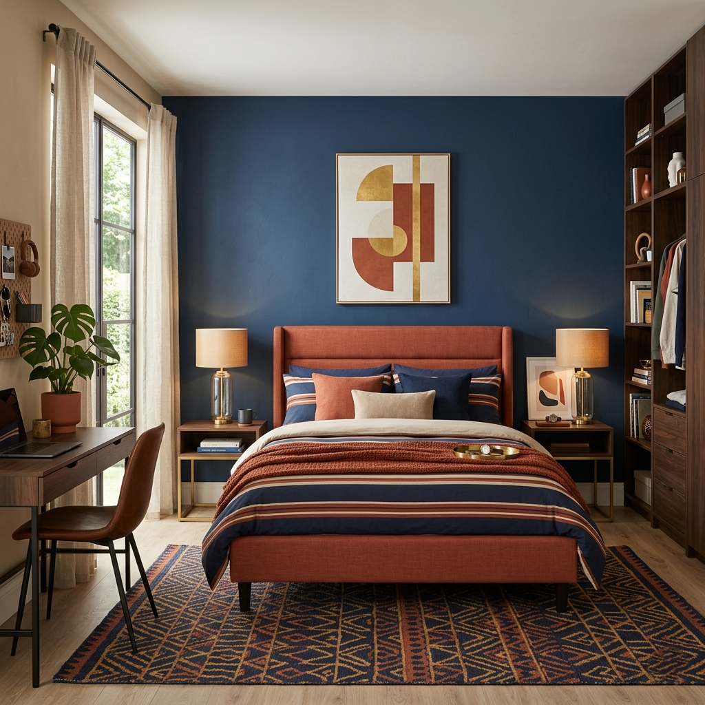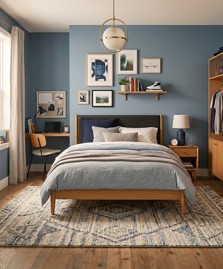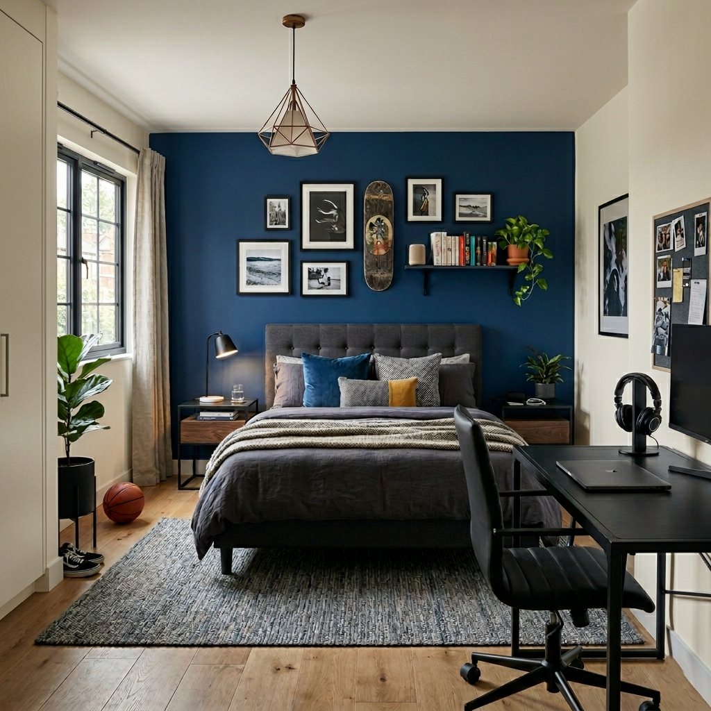 Point focal identifié et mis en valeur (mur décoré, tête de lit, étagère, zone bureau)