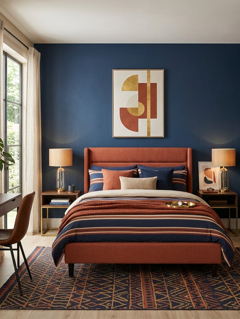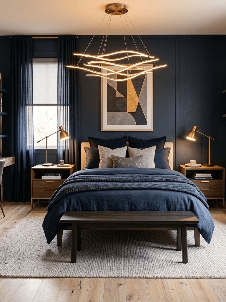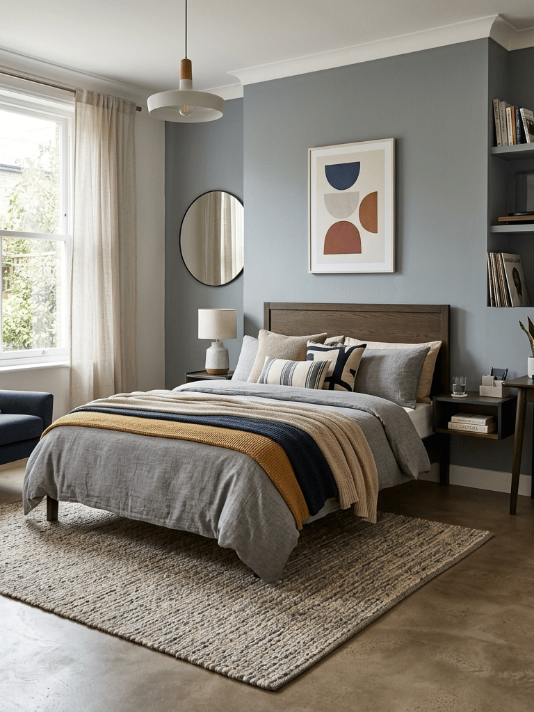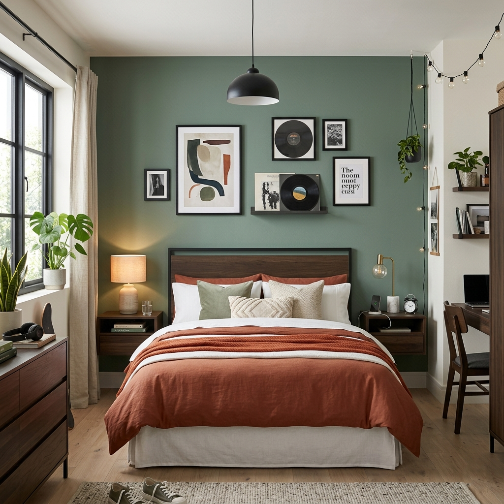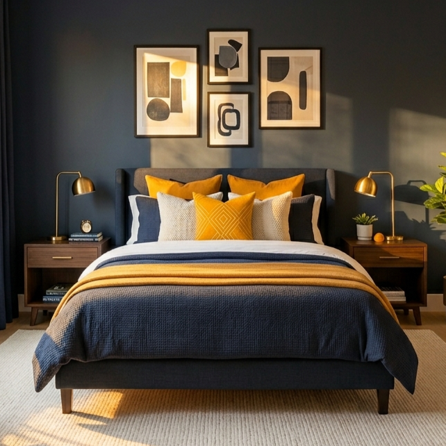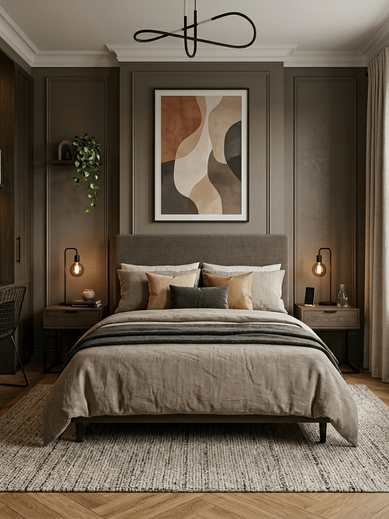 Point focal identifié et mis en valeur (mur décoré, tête de lit, étagère, zone bureau)