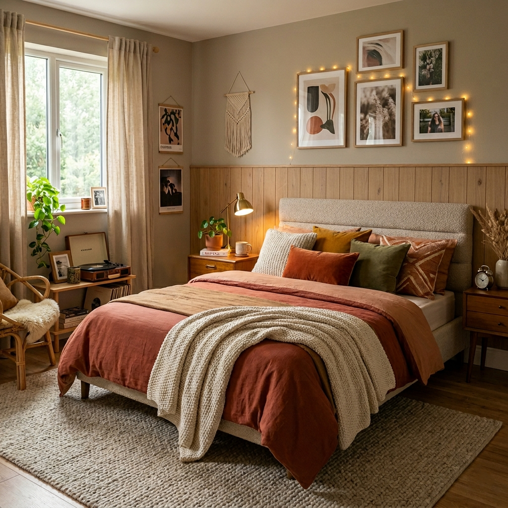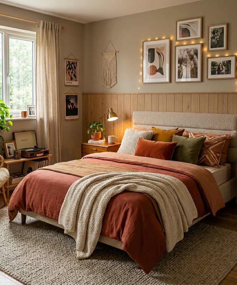 Mélange de textures pour une ambiance chaleureuse (coton lavé, bouclé, bois, velours doux pour ados)