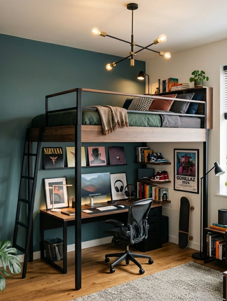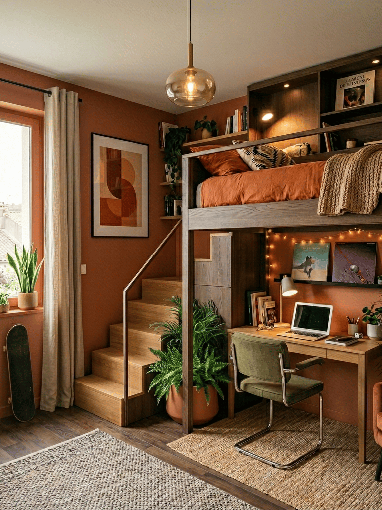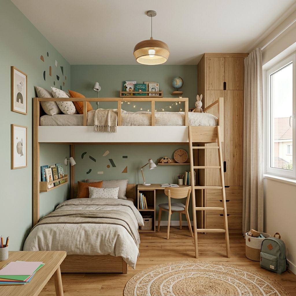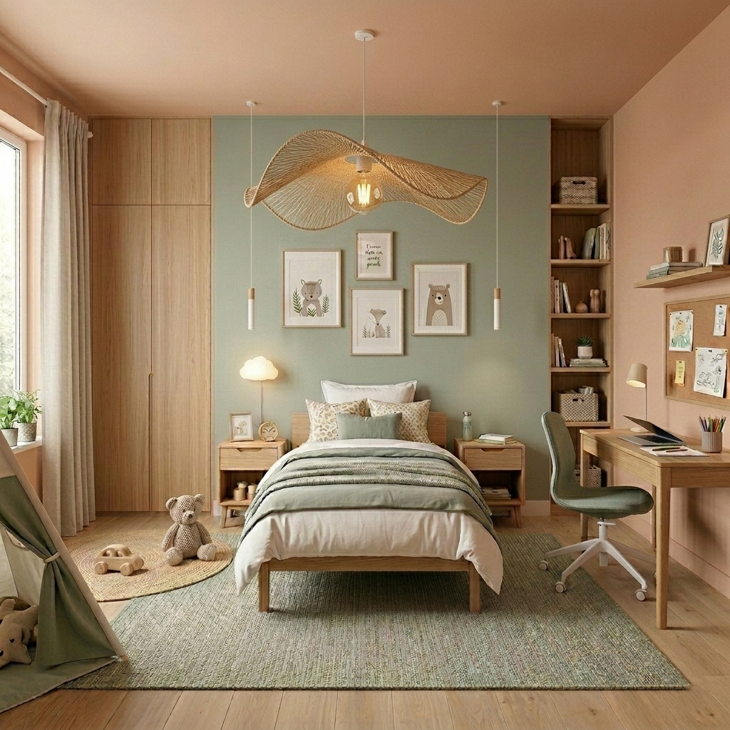 Bureau indispensable, rangements organisés, zone jeu + zone étude, ambiance apaisante.