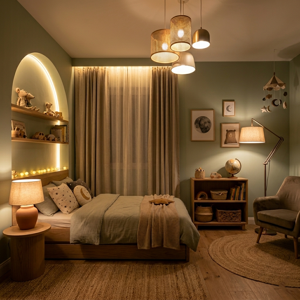Éclairage réparti en plusieurs sources (générale + ambiance + fonctionnelle, veilleuse pour les plus jeunes)