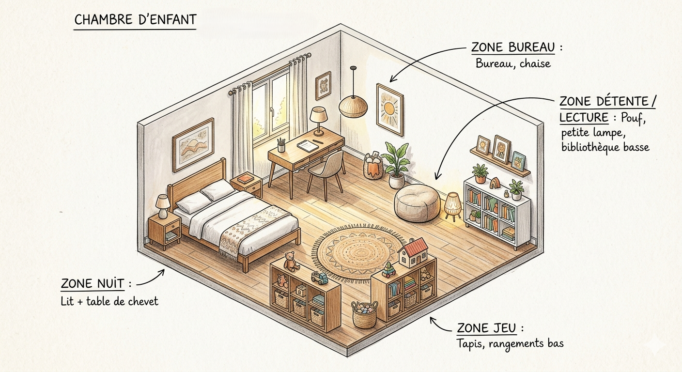 Fonctions de la chambre clairement définies (sommeil, jeu, bureau, rangement, coin lecture)
