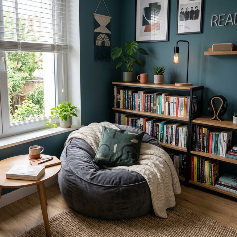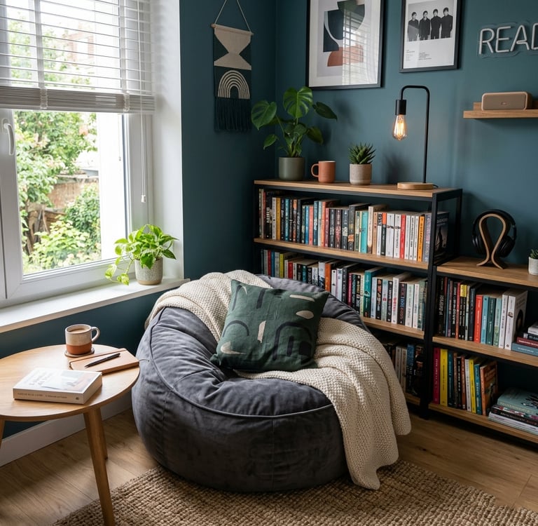 Un coin calme pour lire, se poser ou recevoir un ami. Pouf, fauteuil, petite lampe, bibliothèque basse.