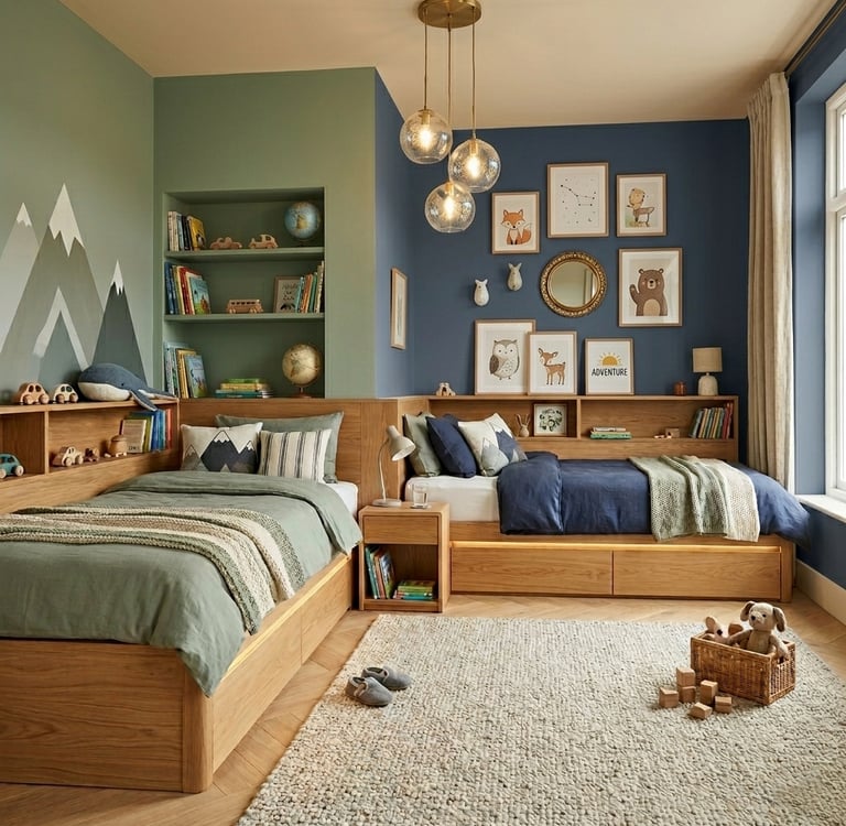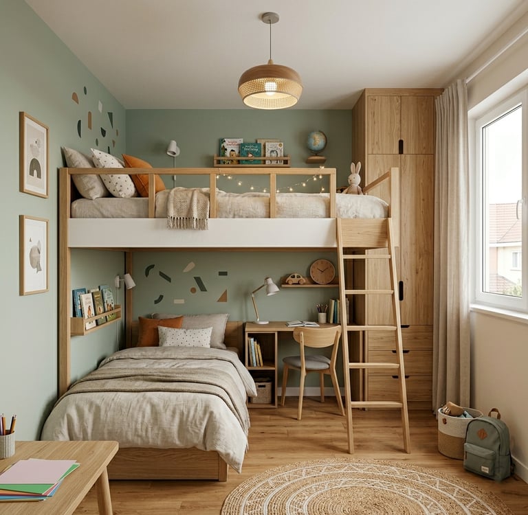 Deux enfants = deux besoins. Lits superposés ou lits en L, rangements séparés, zones bien définies.