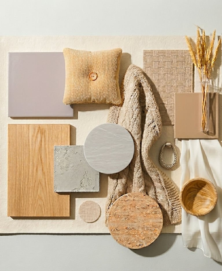 Couleurs claires (blanc cassé, sable, lin, bleu doux)