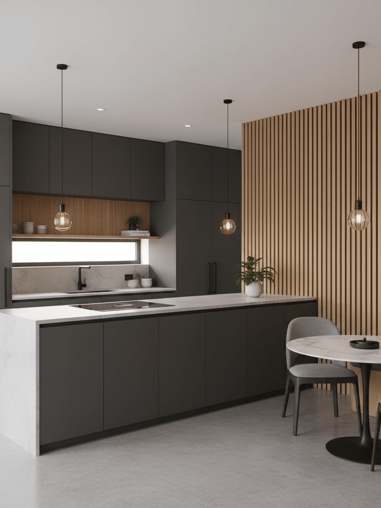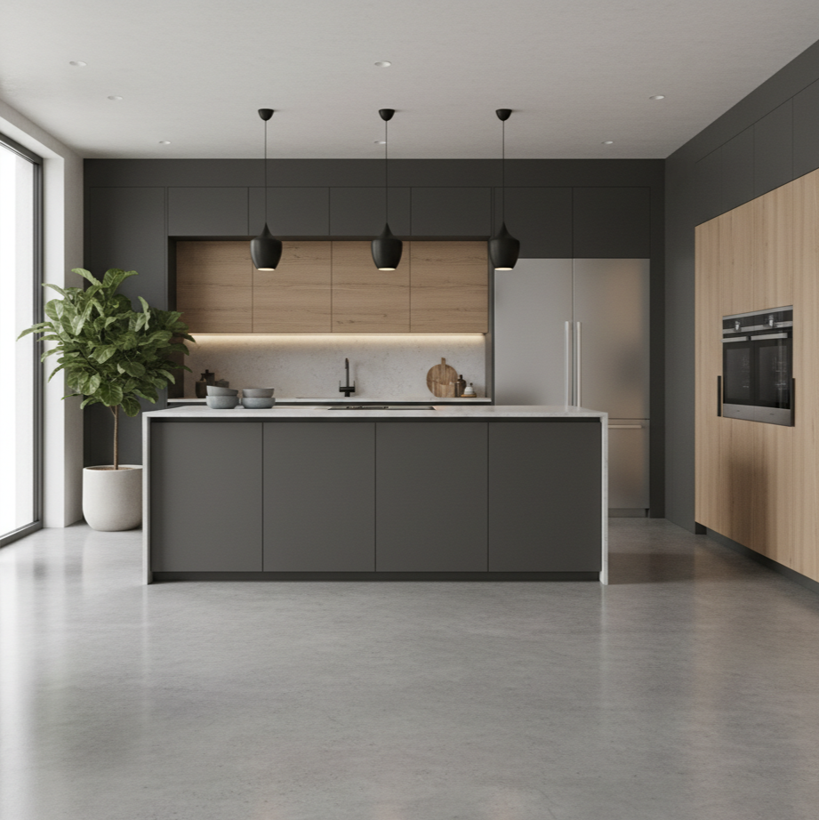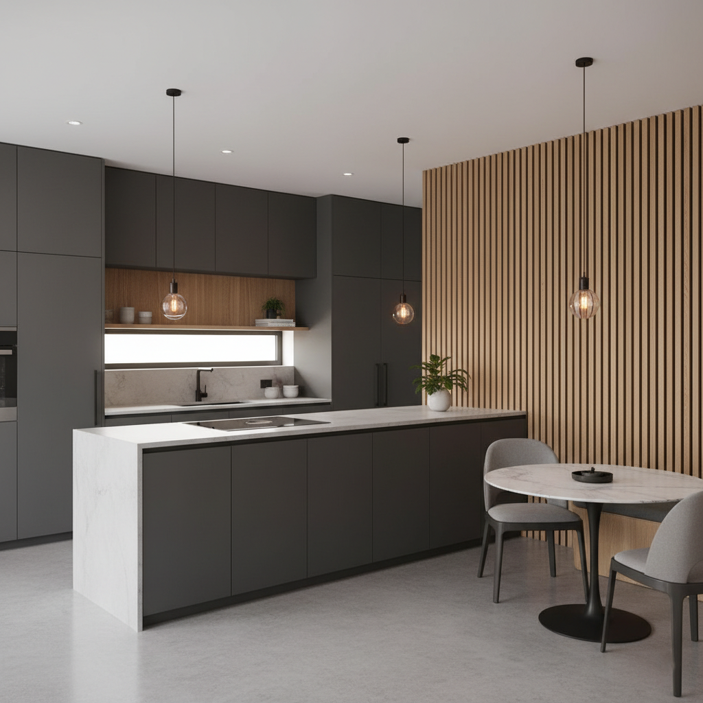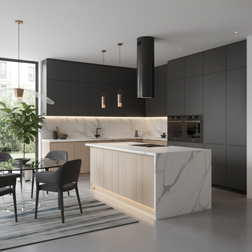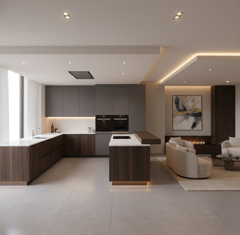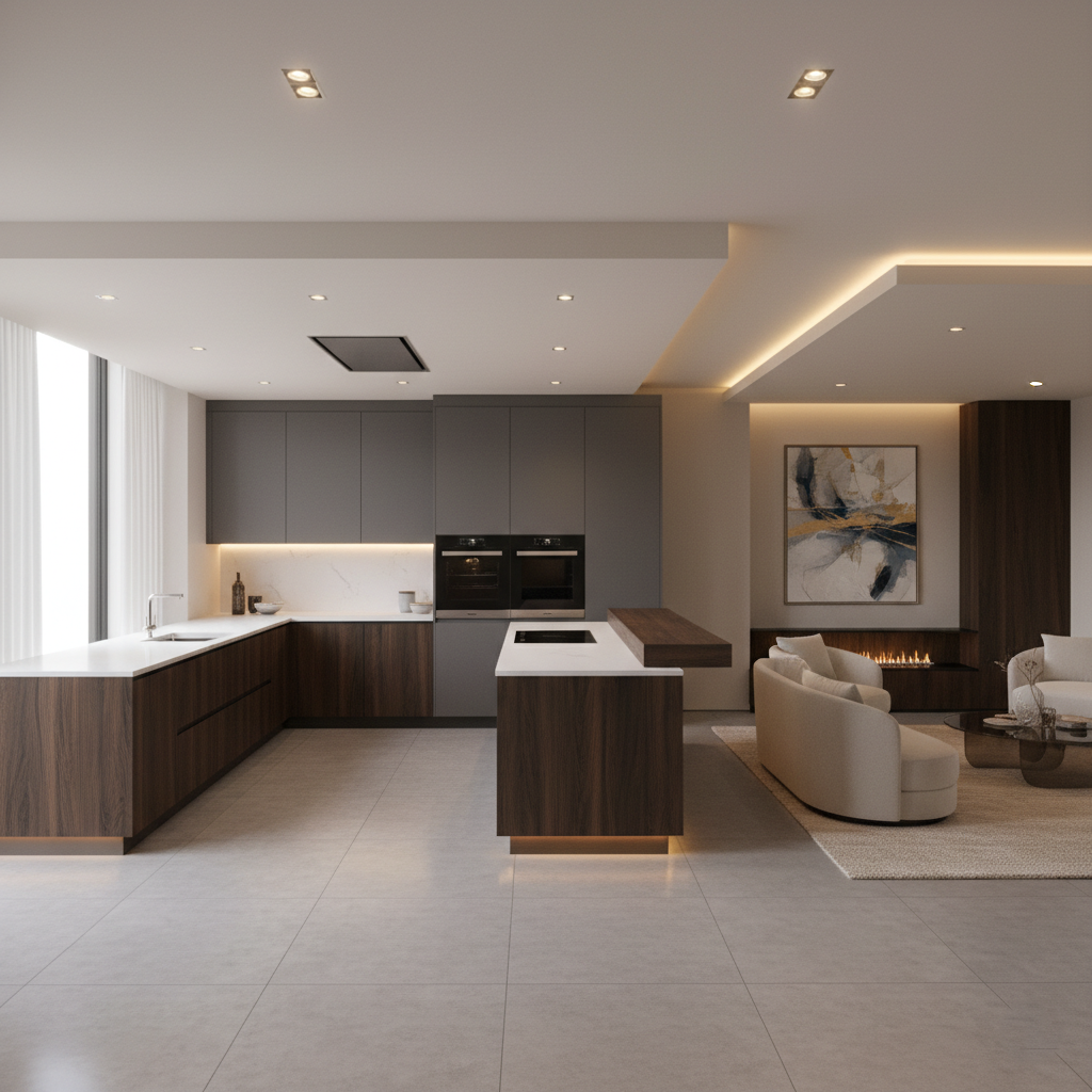 Pour les grandes pièces de vie modernes, cohérence esthétique avec le salon, rangements fermés pour limiter le désordre visuel, hotte performante, délimitation visuelle (îlot, péninsule, éclairage)