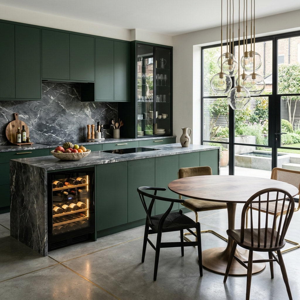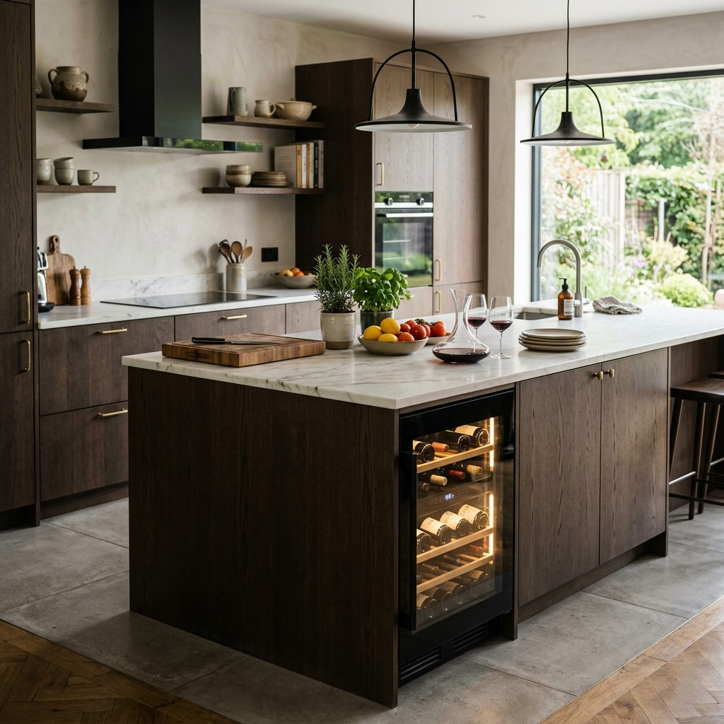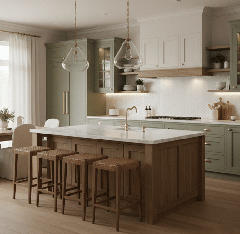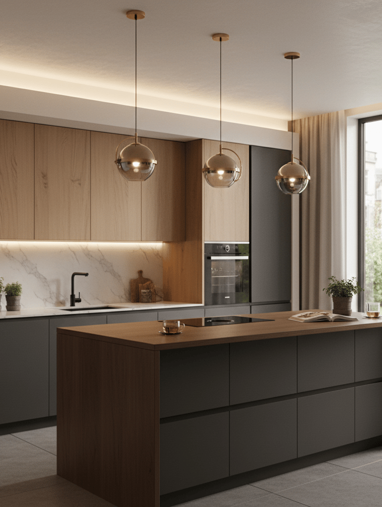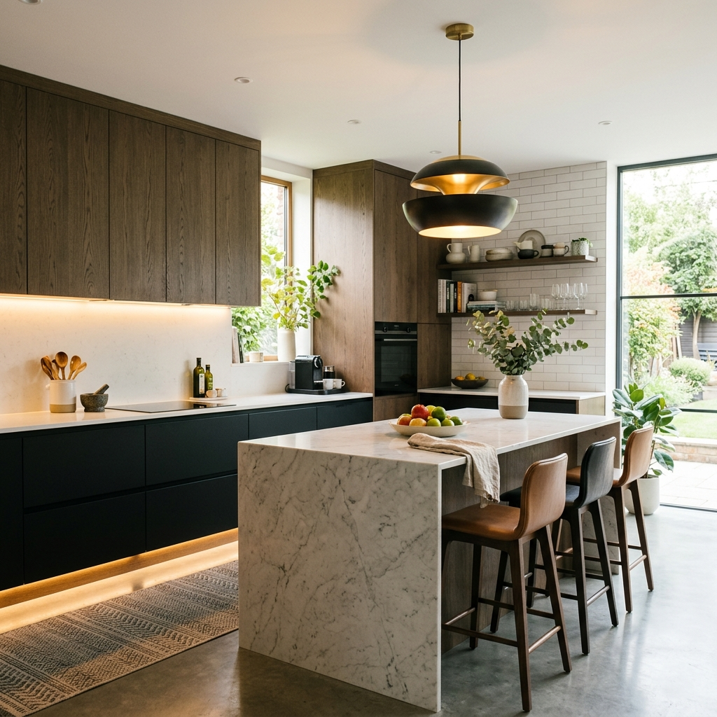 Une fois la structure posée, il est temps d’affiner l’ambiance et les détails pratiques (proportions des meubles, choix des matériaux, palette de couleurs, éclairage général + éclairage de travail, poignées, robinetterie, accessoires et optimisation du rangement) C’est cette étape qui donne à la cuisine son caractère, sa durabilité et son confort d’usage.