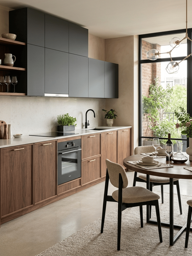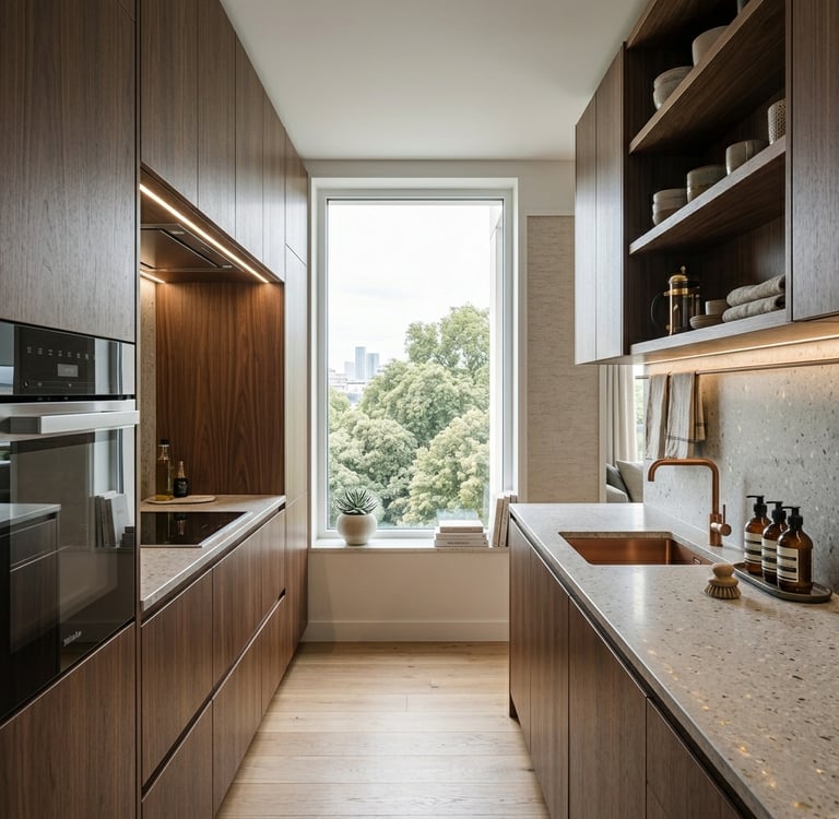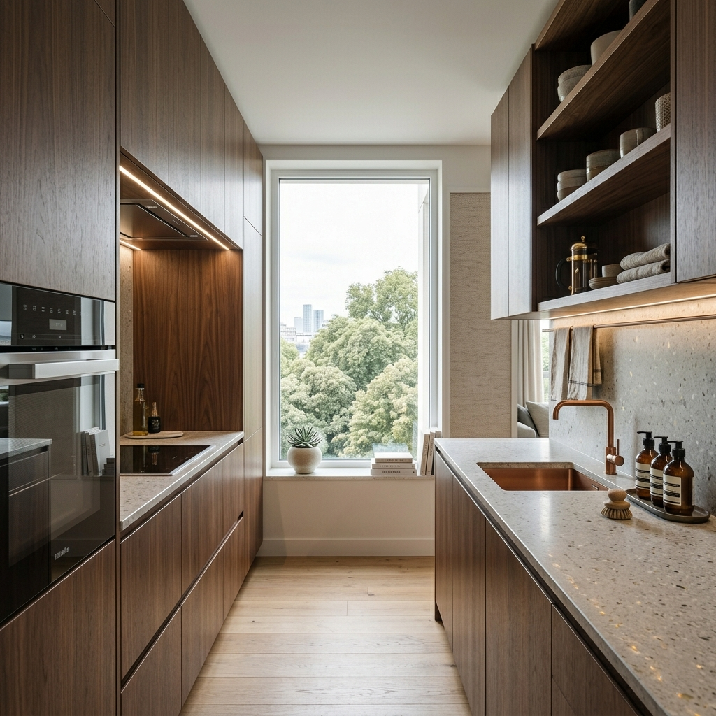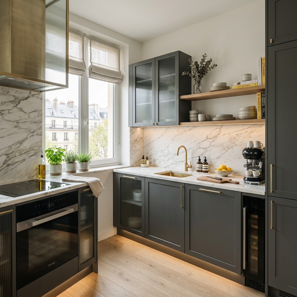 Pour les espaces où chaque centimètre compte, implantation simple (linéaire ou L), meubles hauts jusqu’au plafond, électroménager compact ou encastré, couleurs claires et éclairage soigné