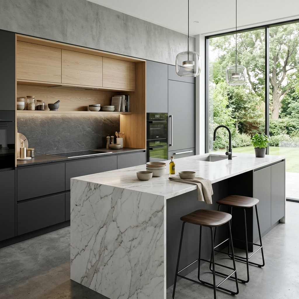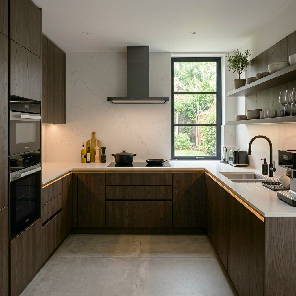 Une cuisine doit rester facile à nettoyer, les surfaces doivent être adaptées à un usage intensif, les zones sensibles (évier, plaques, poignées) doivent être accessibles, et les rangements doivent permettre de garder l’espace ordonné.