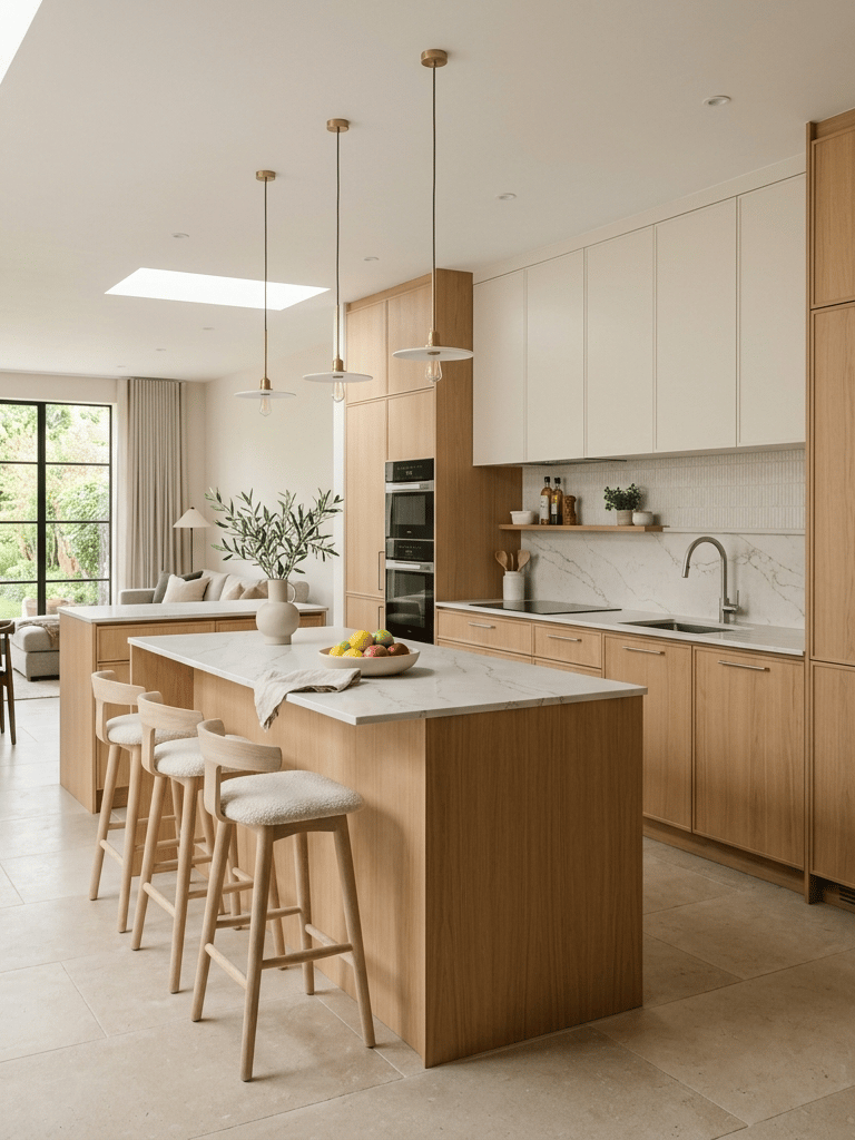 La cuisine doit être simple à traverser, même lorsque plusieurs personnes l’utilisent, les ouvertures doivent rester dégagées, les portes d’électroménager doivent pouvoir s’ouvrir sans gêner, et l’espace autour d’un îlot doit permettre de circuler sans contrainte.