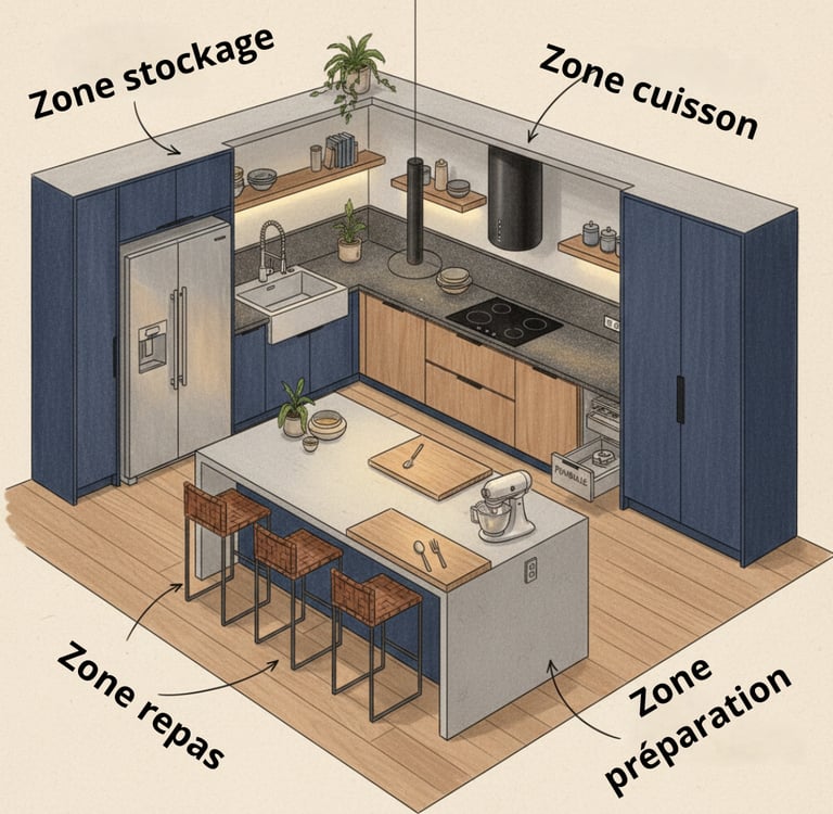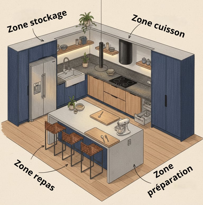 Une fois l’implantation posée, il faut organiser la cuisine en zones lisibles et ergonomiques. Chaque zone doit être pensée pour limiter les déplacements et faciliter les gestes du quotidien (zone préparation, cuisson, lavage, stockage, repas...) Cette structuration donne du rythme, améliore la fluidité et évite les cuisines désorganisées.