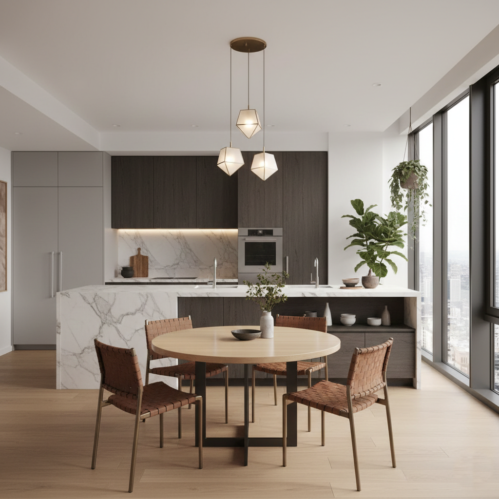 Pour les repas réguliers en famille ou en couple, table adaptée au nombre de personnes, chaises confortables, circulation fluide et éclairage doux.