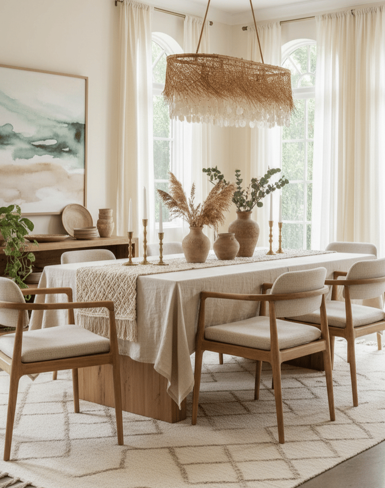 Textiles bien choisis (rideaux du sol au plafond, tapis tissé plat si présent, nappes adaptées)