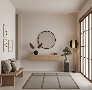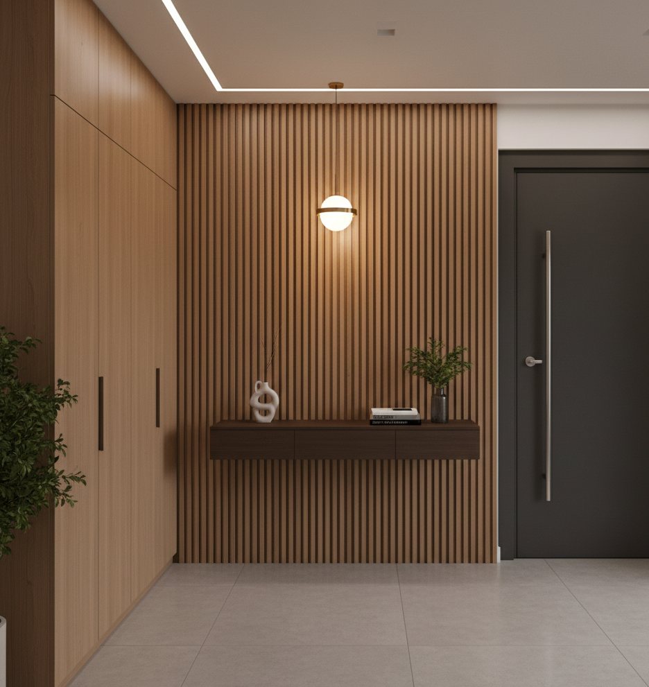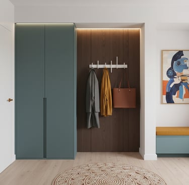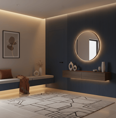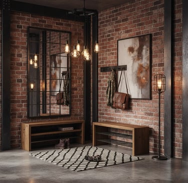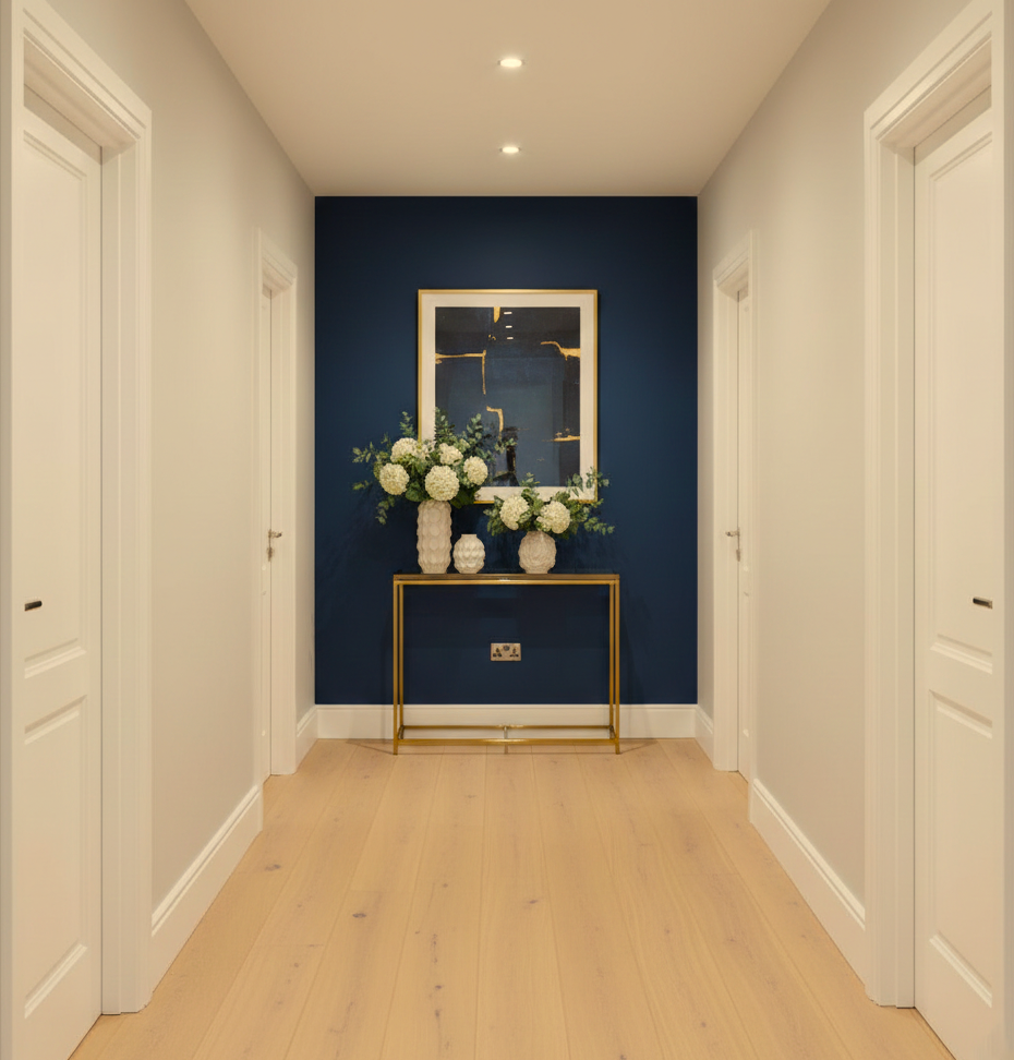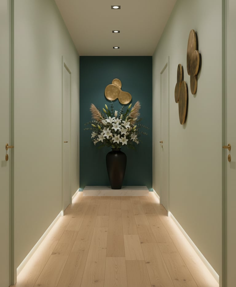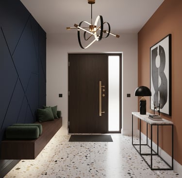 Dans une entrée ou un couloir, un élément d’accroche visuelle (équivalent du point focal) permet de structurer l’espace et de guider le regard (mur d'accent, console...) Une fois cet élément identifié, il devient le repère pour positionner les meubles, organiser les rangements et structurer l’ensemble de l’espace.