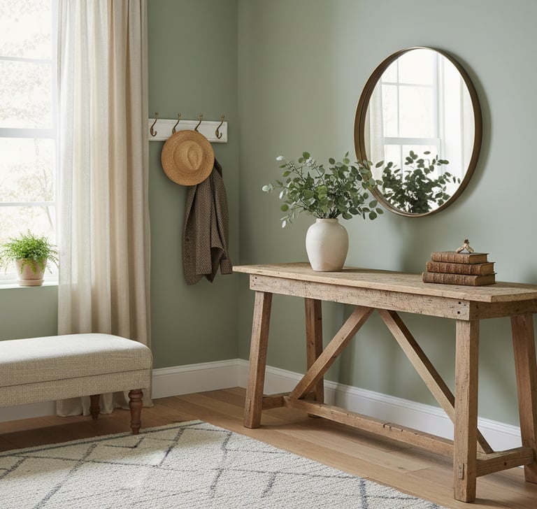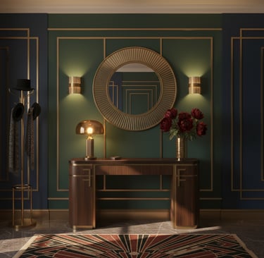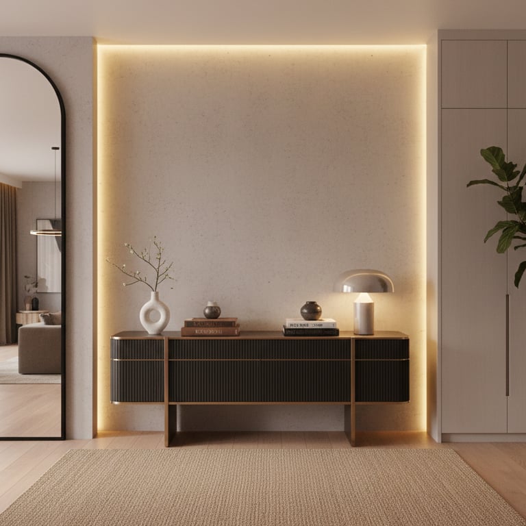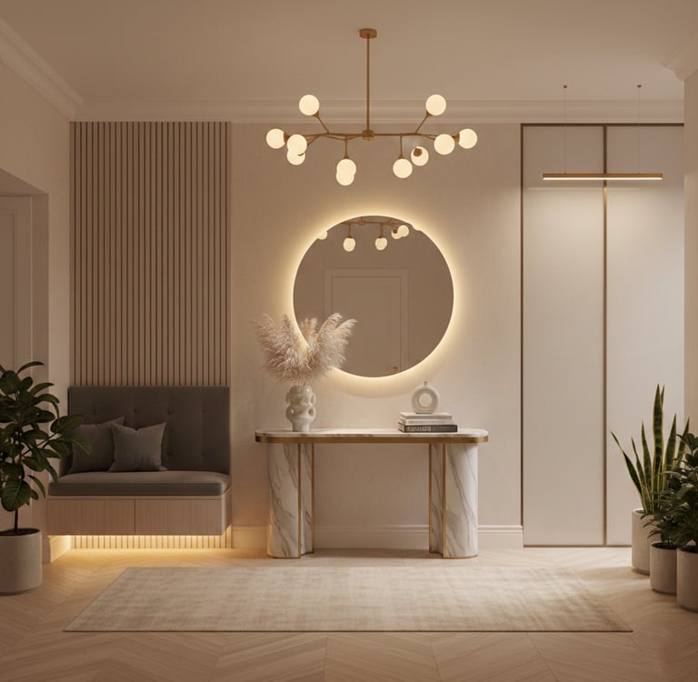 Pour créer une belle première impression, console décorative, miroir, éclairage soigné, quelques objets choisis.