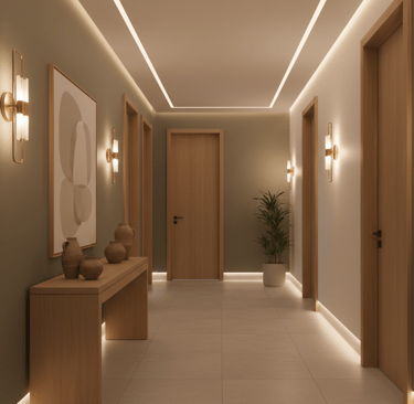 Ces espaces sont souvent sombres ou sans fenêtre, la lumière naturelle doit être préservée autant que possible, et l’éclairage artificiel doit être pensé pour éviter les zones d’ombre, allonger visuellement les couloirs et rendre l’entrée accueillante