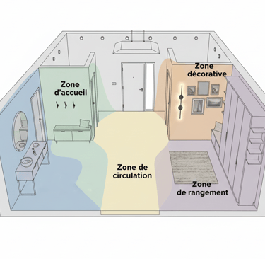 Une fois l’implantation générale posée, il faut organiser l’entrée et les couloirs en zones lisibles, même dans un petit espace, cette structuration clarifie les usages et améliore la fluidité. Par exemple une zone d’accueil (console + miroir), une zone fonctionnelle (patères, meuble à chaussures) et une zone de circulation dégagée.