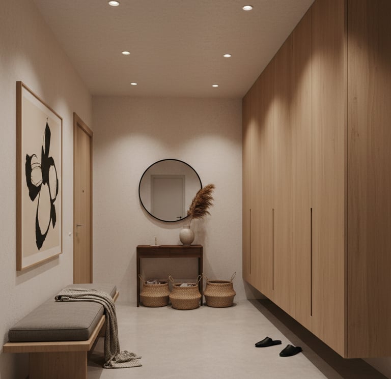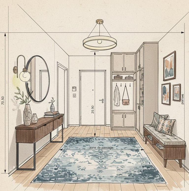 Avant toute décision, il faut comprendre l’entrée et les couloirs tels qu’ils sont : lumière naturelle disponible, largeur et longueur, zones de passage, portes et ouvertures, contraintes de profondeur... Cette analyse sert de base à toutes les étapes suivantes.